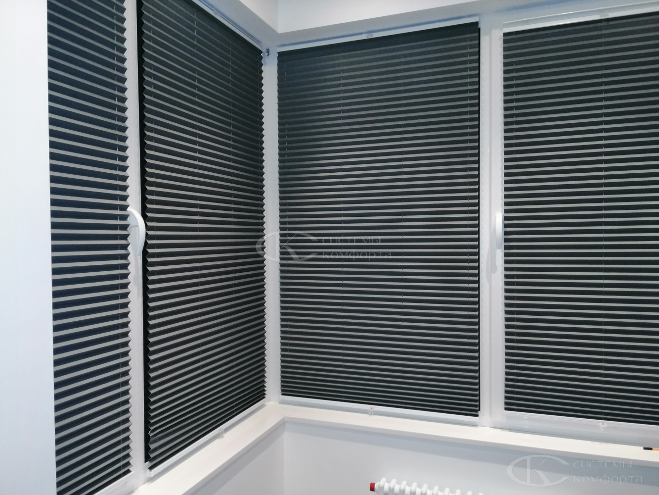 Достаточно дорогой вариант, сочетающий достоинства обычных пластиковых жалюзи и штор. Полотно собрано в чёткие складки, в опущенном виде выглядит как штора, а в собранном занимает минимум места. Особенно эффектно плиссированные жалюзи смотрятся на лоджиях с большой площадью остекления.
